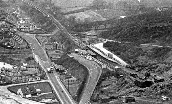 The usual view from Hospital Hill, this time in the 1930s. After demolition of the station the bus depot was quickly built on the west end of the station site. The two platforms are still visible in