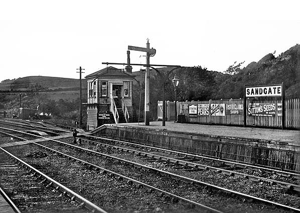 Sandgate signal box at the west end of the down platform in June 1927. Almost identical boxes were provided at Hythe and Sandling Junction. The down platform line was a goods road, hence the loading gauge over the line.