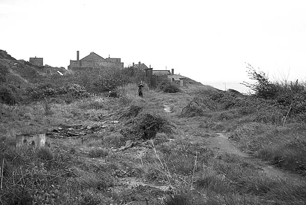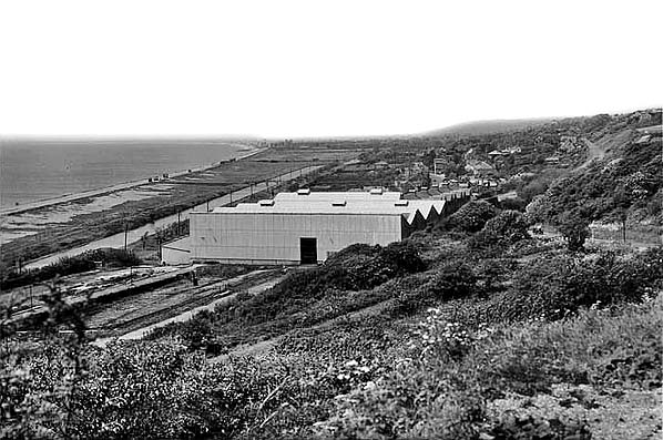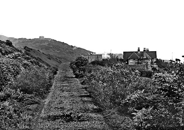 Looking east from Cliff Road bridge towards the site of Sandgate station in the 1930s. The bus depot on the station site is the light coloured building in the distance. The Sandgate down distant signal stood on the right in the foreground. A Martello tower is seen on the hillside in the distance.