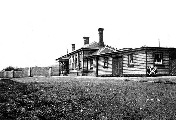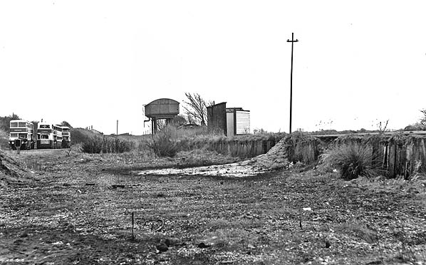 from Brian Hart collection Sandgate station looking east in March 1939. The water tank is still there at this time but the site of the engine shed is marked by a clump of bushes. The gents' toilet is still in good order and used by bus crews. Buses can be seen encroaching onto more of the station site. The depot is some distance behind the photographer. Photo
