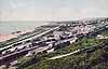 An aerial view of Sandgate station in 1929. Note the steep approach road from Seabrook Road. Although not visible in this view there is an alternative route to the station with a steep flight of steps up to the far end of the station forecourt. The layout of the east end of the station is clearly visible. The water tower is seen at the end of the up platform with the engine shed at the end of the line. The two-storey stable is seen to the right of the engine shed with the yard crane in front of it. A number of coal wagons are in the siding. Access to the goods yard was from Hospital Hill. Reproduced with the kind permission of Simmons Aerofilms Ltd
