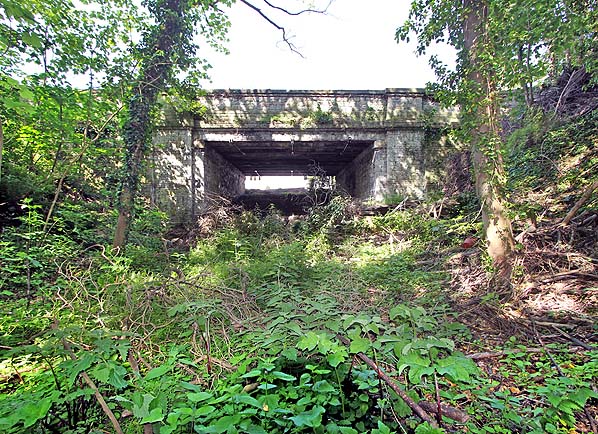 Looking west along the trackbed at Cliff Road bridge in May 2014. On the far side of the bridge the cutting has been infilled. Photo by Nick Catford