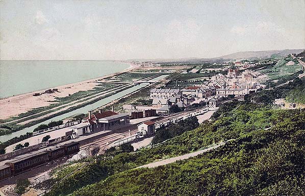 The view from Hospital Hill overlooking Sandgate station and the Royal Military Canal with the land curving round towards Dungeness in the distance has always been a popular vantage point for photographers. This view shows goods wagons in the down platform road and coal wagons in the siding at the east end of the station. The stationmaster's office is seen to the left of the main station building; two workmen are standing on ladders in front of it. A number of poster boards are noted next to the office waiting to be erected. A siding can just be made out running behind the up platform. This ran on down the approach road to join the Hythe & Sandgate tramway. The photograph was probably taken shortly before the gents' toilet was relocated in 1905.This is a tinted version of a