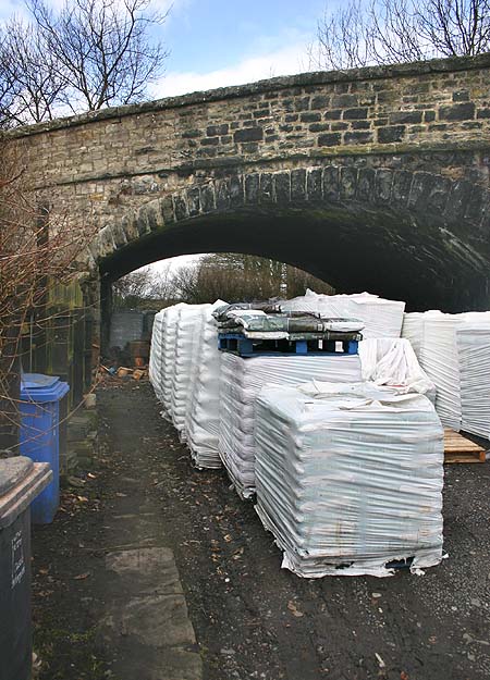 Scotsgap Station looking north west in March 2006. The platform edge can be seen to the right of the dustbins. Photo by Nick Catford