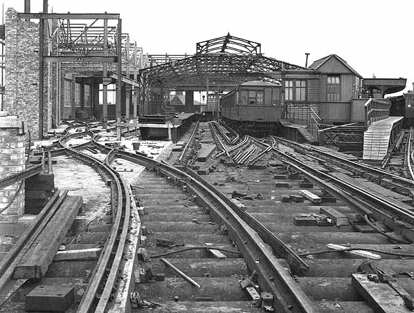 The original platforms at Seaforth Sands seen during demolition in August 1925. The platforms were demolished to make way for a maintenance depot the first section of which is seen to the left under construction. The depot opened in 1926.