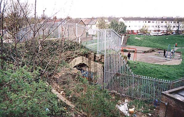 ![]() The site of Seven Sisters Station looking north west in 2001. The south end of the embankment and the subway linking the four platforms can be seen.