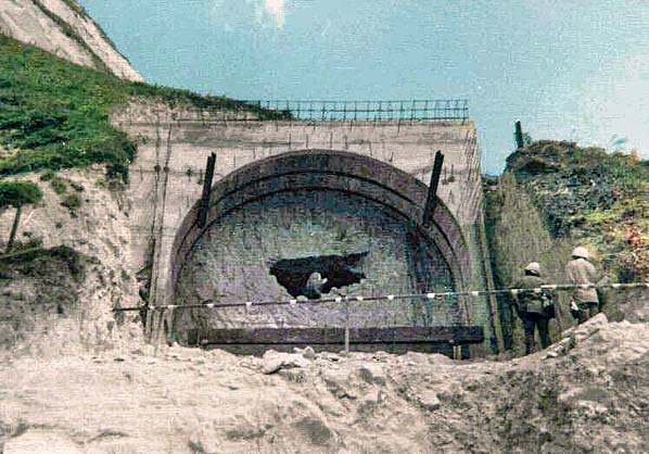 The road tunnel break thorough at the base of Shakespeare Cliff in 1973. Construction workers stand back as a Dosco Roadheader breaches the chalk beneath the concrete archway.
