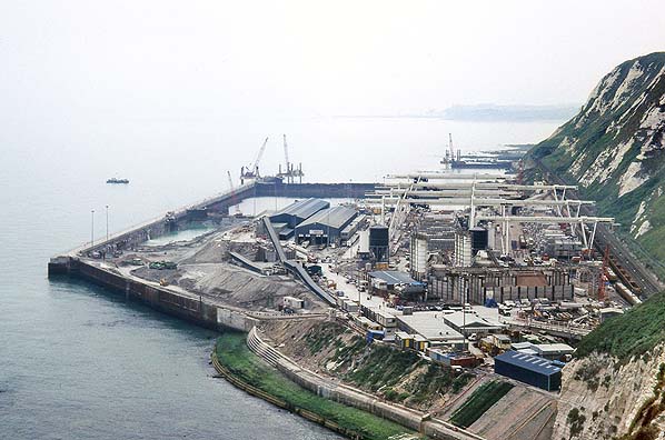 [Source: Nick Catford] ![]() Channel Tunnel work site seen from Shakespeare Cliff in August 1989. The dams are nearly completed. The nearer one is almost pumped out and filled in. Horizontal rail-based cranes are seen on the right. Photo by Graham Knott from his Flickr photostream