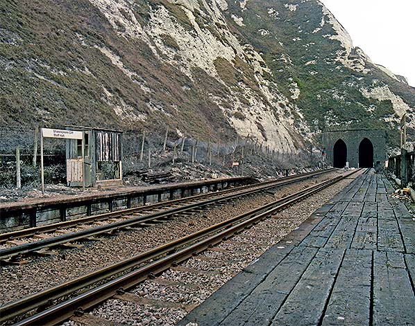 Photo by Andy Veitch from his Flickr photostream ![]() Looking east towards the west portal of Shakespeare Tunnel from the up platform of Shakespeare Cliff Staff Halt in September 1984.New BR Corporate Identity signage has been installed on the platforms which now show the name Shakespeare Cliff Staff Halt.