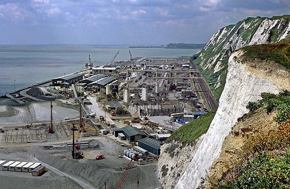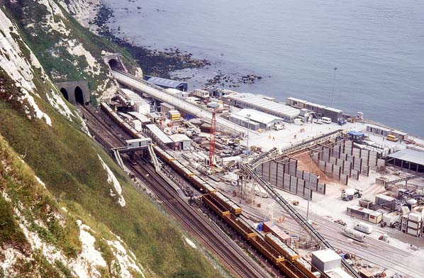 Photo by Alan Young ![]() The Channel Tunnel construction site in June 1991. The site required for the Channel Tunnel construction was considerably more than the former colliery site. This required land to be reclaimed from the sea. To do this, steel sheets were driven into the sea bed to make a coffer dam; this was subsequently filled with concrete. The enclosed area was then pumped out and filled with sand.