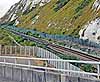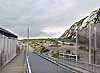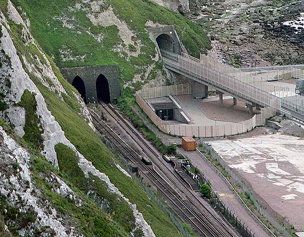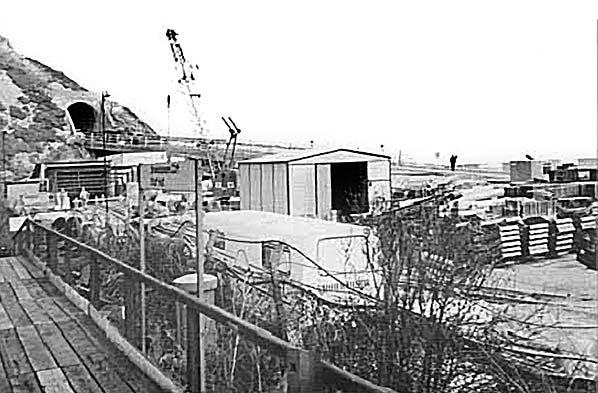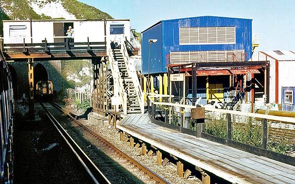 Photo by R Willis ![]() The Channel Tunnel construction site seen from Shakespeare Cliff in August 1989. The halt has been refurbished with a lengthened up platform and a new footbridge with offices on the bridge. The road access tunnel built in 1974 is seen to the right of Shakespeare tunnel. Between the two, the ramp down to the Channel Tunnel is seen.