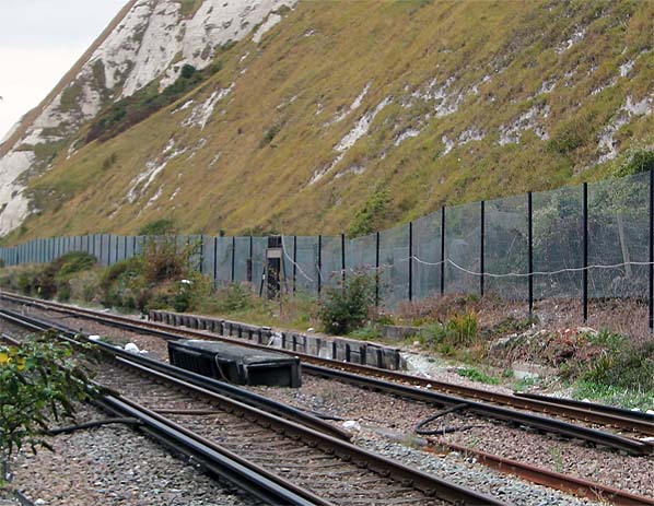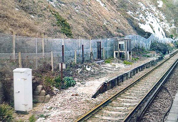 Photo by Adrian Nichols from his Flickr photostream ![]() Following the completion of the Channel Tunnel in 1994 the halt fell into disuse. The footbridge has been demolished and much of the timber of the waiting hut has fallen away. The halt nameboard is still there but noiw without its name. Behind the platform, two rows of fencing can be seen, protecting the line from the less serious chalk falls