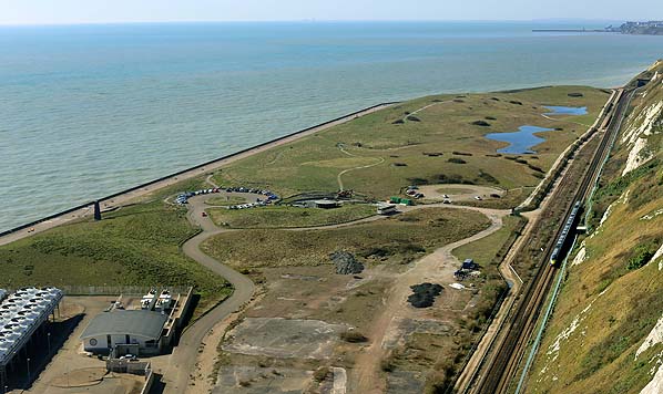 ![]() Once construction works for the Channel Tunnel were completed, the site was landscaped to provide an undulating topography including some low-lying wetlands. The Samphire Hoe country park opened on 17 July 1997. This view from Shakespeare Cliff dates from March 2014 The building on the left is part of the ventilation system for the Channel Tunnel. Air is supplied to the Channel Tunnel from here and a similar plant at Sangatte. Either of the two buildings is capable of supplying all the air required to ventilate the tunnel. Supplementary ventilation also exists on either side of the tunnel. In the event of a fire, ventilation is used to keep smoke out of the service tunnel and move smoke in one direction in the main tunnel to give passengers clean air.