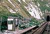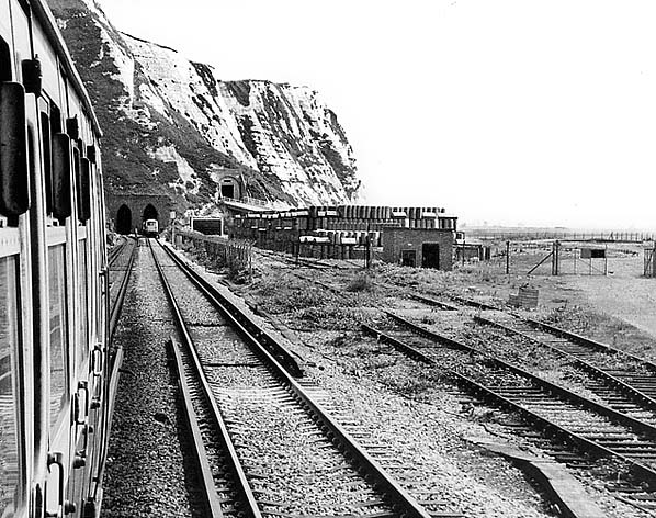 ![]() The abandoned Channel Tunnel work site looking east seen from a passing 4-VEP unit on the down line with a Class 73 diesel loco just visible emerging from the western portal of Shakespeare Tunnel.