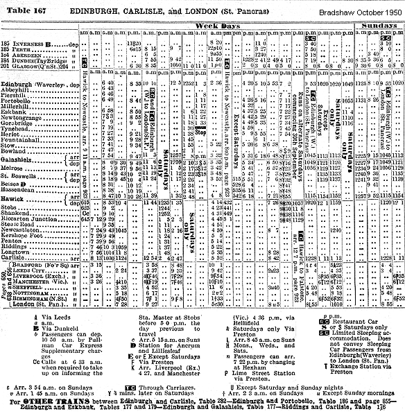Other passenger services (usually three per day) were also worked by A3s, although Thompson B1 4-6-0s made regular appearances. There was also a daily Gresley A4 diagram between Edinburgh and Carlisle - an overnight fitted freight southbound, returning with the early morning parcels train. Thompson Pacifics appeared later on, just before the line was dieselised, in a drive for efficiency. In addition there were also several local passenger workings between Galashiels and Edinburgh (some via the Peebles loop, which opened in stages between Galashiels and Eskbank between 4 July 1855 and 1 October 1864) and between Hawick and Carlisle. These tended to be hauled by B1s.