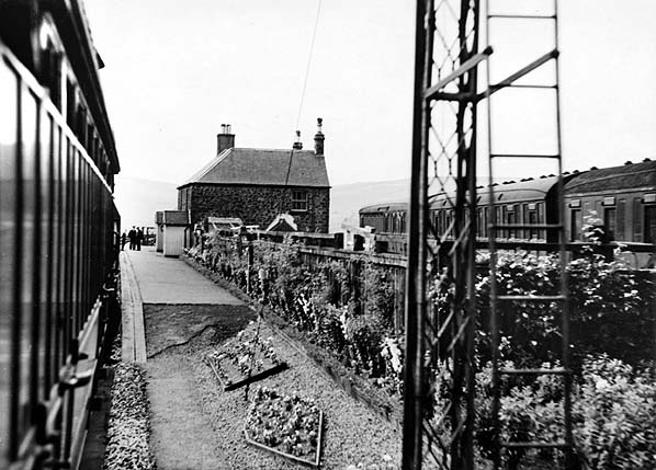 The station was provided with two low platforms. The main station building was of stone comprising a two-storey stationmaster's house with a recess in the centre at the front and a single-storey booking office at its north end on the up side. There was no weather protection for passengers on the down side. Passengers arriving at the station had to reach the booking office via a barrow crossing over the sidings. Passengers needing to cross the running lines had to use another barrow crossing at the north end of the station, but a metal footbridge was eventually provided c.1962.