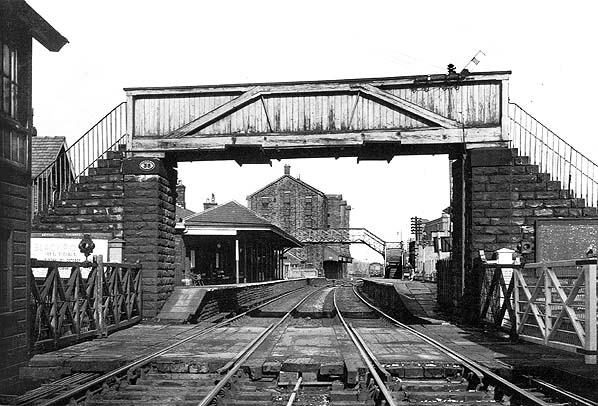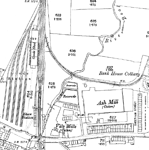 footbridge, located to the north of the building, provided access to the Oldham platform. There was an extensive goods yard on the down side of the line north of the station, and sidings ran behind the down platform. The yard included an impressive four-storey goods shed, a cattle dock, coal yard and offices and a 5-ton crane. There were two private sidings, Crompton's and Jubilee, and a further private siding on the east side of the station served Bank House Colliery. Shaw signal-box was on the down side, south of the level crossing,