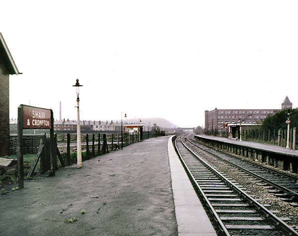 From April 1966 further changes took place. The service pattern was altered so that most trains ran between Manchester Victoria and Oldham Mumps with only a few continuing onward to Rochdale. By 1968 Shaw & Crompton had only an hourly service in each direction. The goods shed was demolished in the 1960s, and the station buildings survived until the early 1970s when they were demolished and replaced with basic shelters.