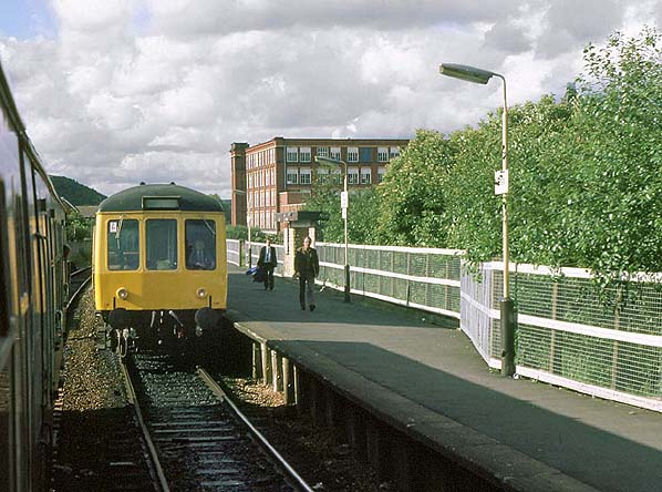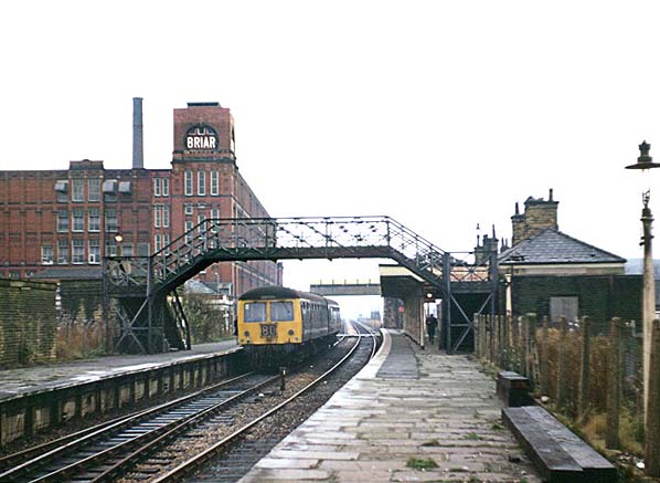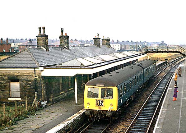 In June 1958 British Railways introduced Diesel Multiple Units (DMUs) onto the Oldham Loop. A Cravens-built type of DMU (later known as class 104) which had twin power cars was used on the line as they were easily able to cope with the steep gradients. The service pattern at Shaw & Crompton was a train every 40 minutes in each direction. |