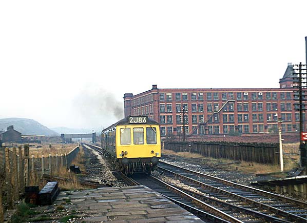 ![]() Looking north from the north end of the Rochdale platform at Shaw & Crompton in November 1972 as a two car class 108 Derby Built DMU heads towards Rochdale.