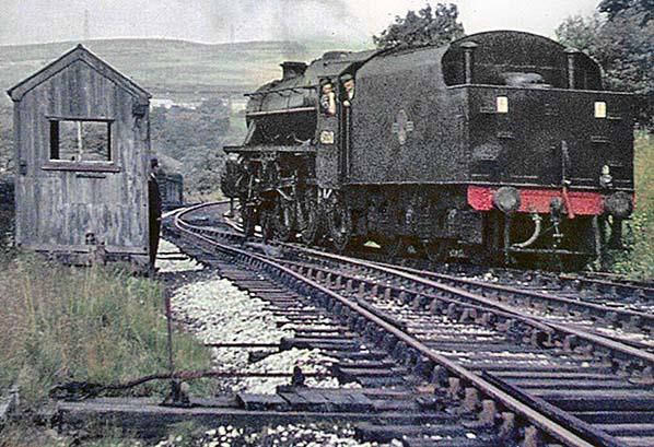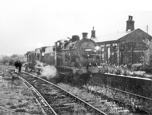 ![]() Looking south-east at Shawclough & Healey station on 19 February 1967 as the LCGB and Roch Valley Railway Society ‘L&Y Pug Rail Tour’ which visited the surviving section of the Rochdale–Bacup line pulls out of the station. Goods were handled in the station’s sidings until 1964, and three years later the goods warehouse, in the background, is still in place.