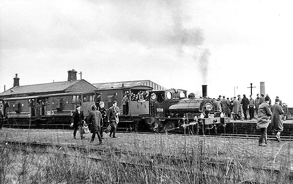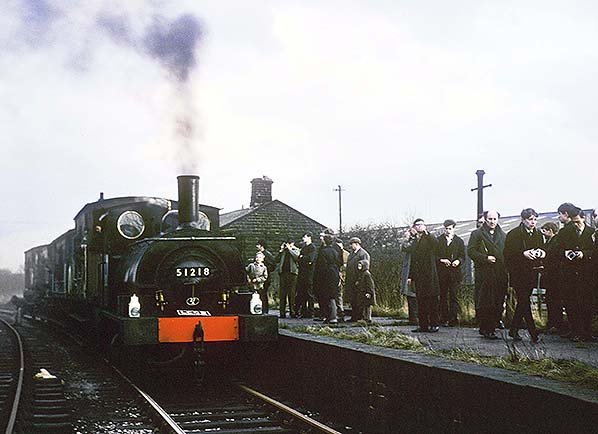![]() Looking south-east at Shawclough & Healey station on 19 February 1967 on the occasion of the LCGB and Roch Valley Railway Society ‘L&Y Pug Rail Tour’ which visited the surviving section of the Rochdale–Bacup line whose terminus from 1963–67 was Whitworth. Photo-stops were made at Wardleworth and, here, at Shawclough & Healey. Although passenger trains were discontinued in 1947 the station building remained in use until January 1964 as the goods office where the stationmaster / goods agent for Shawclough, Whitworth and (until 1963) Facit was based. In the days when this railtour took place there were no ‘health and safety’ qualms about allowing the passengers to use the abandoned platform or even stroll around on the tracks. Goods were handled in the station’s sidings until 1964, and three years later the goods warehouse, in the background, is still in place. The locomotive, No.51218 is an Aspinall 0-4-0 saddle tank, fondly known as a ‘Pug’. She was built at the LYR Horwich works in October 1901 and as a LYR Class 21 first carried the number 68, being re-numbered 11218 in LMS days. On 30 September 1964 she was withdrawn from 87A, Neath Court Sart shed, and was purchased by the L&Y Saddletanks Fund and housed on the Keighley & Worth Valley Railway. The Saddletanks Fund later became the Lancashire & Yorkshire Railway Preservation Society, and more recently the Lancashire & Yorkshire Railway Trust, which now owns 51218.Three round trips in four brake vans trips were made on the tour between Rochdale and Whitworth, the northern terminus of the line.