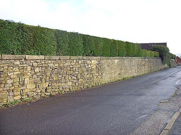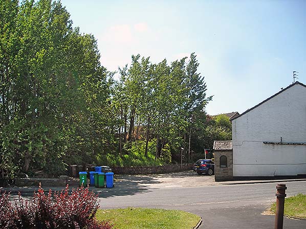 Photo by John Mann ![]() Looking south-east along Dell Road in January 2012. The stone wall on the left was at the back of the passenger station and short siding of Shawclough & Healey, of which no traces remain. A residential development called Columbine Close, a cul-de-sac off Campion Way, occupies the site.