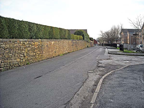 Looking south-east along Dell Road in February 2016. The stone wall on the left was at the back of the passenger station and short siding of Shawclough & Healey, of which no traces remain. A residential development called Columbine Close, a cul-de-sac off Campion Way, occupies the site.