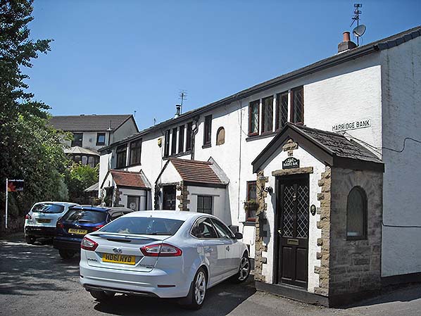 These cottages were already in existence when the railway was constructed close-by, on an embankment immediately left of the photograph. They were adopted for railway staff use because they were conveniently located for the Shawclough & Healey station, which stood on the elevated ground where the new houses can be seen. The cottages are known as Harridge Bank. The view is northwards from Dell Road in June 2015.