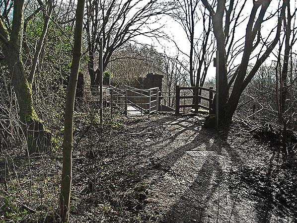 Looking south-east across the bridge over the lane to the former Harridge Mill asbestos works in February 2016. A small stream also passes beneath it. Just beyond this bridge the railway tracks fanned out within Shawclough & Healey station goods yard. This is now part of a footpath and cycle route along much of the former Facit Branch trackbed.