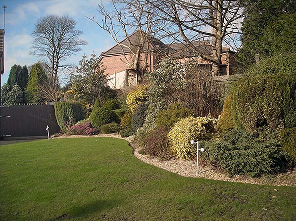 The northern perimeter wall of the goods yard at Shawclough & Healey station in seen beyond the shrubbery to the right. The structure acted both as a boundary and as a retaining wall dividing the goods yard (left) from the higher land to the right, now occupied by the red-brick house. Off the picture to the left is the site of the goods warehouse. The view is looking west from Shawclough Road in February 2016.