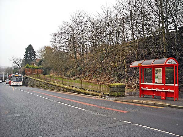 Looking south along Market Street (A671) in January 2016. The sloping track on the right led up to the coal yard at Shawforth station. A Rosso bus on the 464 route from Rochdale to Accrington is approaching, the service which more-or-less duplicates the old railway route from Rochdale to Bacup (passenger service suspended 1947 and closed 1949) and Bacup to Rawtenstall (closed 1966). In the bus shelter the poster reads, ‘Do you need local rail or bus information?’ The ‘local rail’ information is, quite simply, that there has been no local rail at Shawforth for about 70 years.