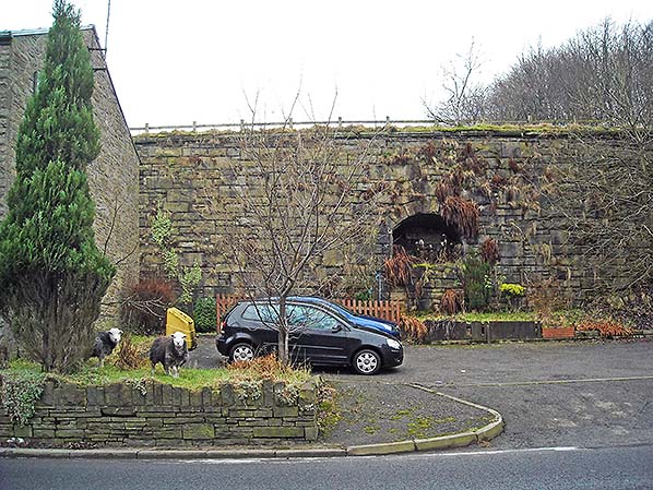 About a quarter of a mile north of the site of Shawforth station the former Rochdale – Bacup railway ran close to Market Street (A671) carried high above the road on a stone retaining wall. The wall is seen here, looking west across Market Street in January 2016 near the junction with Freeholds Road. The significance of the small arch under the railway is not known; nor is the reason why two sheep are grazing on the pocket handkerchief-sized lawn!