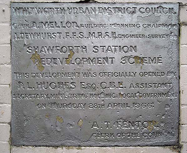 This stone tablet in the former station subway at Shawforth commemorates the launch of the station redevelopment scheme on 28 April 1966 in which the site of the platforms and buildings was absorbed into a small residential estate. The photo was taken in January 2016.