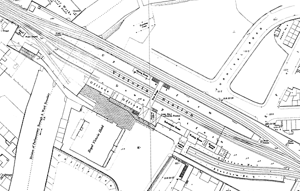 Spanning the platforms was a large glass and iron overall roof. The station received a new roof spanning the main line platforms in 1867 and was enlarged in 1874, the well-known railway contractors Logan and Hemingway being awarded the contract. |