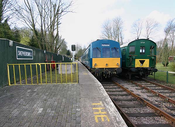 ![]() Shepherdswell Station in April 2008. A Class 101 DMU is in the platform with 2-EPB 5759 in the adjacent terminal road.