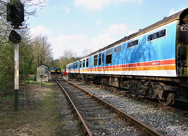 Looking towards Shepherdswell Station in April 2008. A Class 412 BEP 7105 is seen on the right. In the background a Class 101 DMU is in the platform with 2-EPB 5759 in the adjacent terminal road. 'Richborough Castle' diesel shunter is seen on the right. Shepherdswell A signalbox is seen on the left.