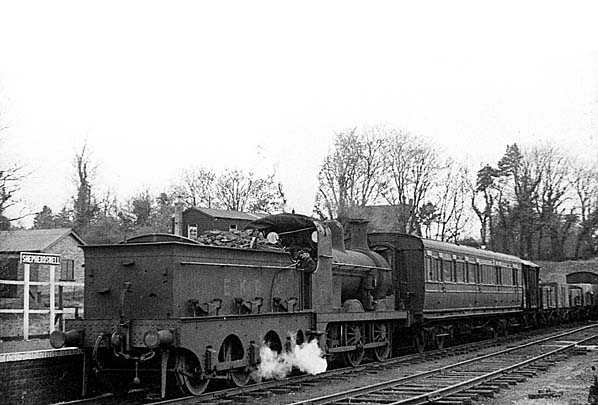 ![]() A mixed train at Shepherdswell Station in April 1947. The new building on the left housed a sewage pump which was of no use to the railway as the station had no toilets.
