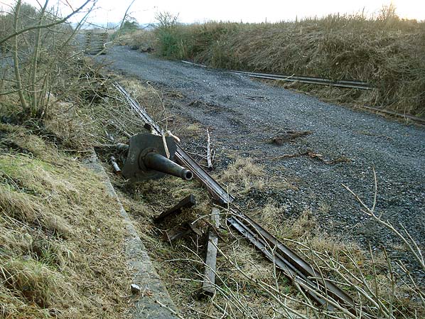 Sherburn Colliery goods dock is seen in December 2012, looking south a short time after the rails were lifted. Rails are scattered about, accompanied by the conical base of the former station crane lie on the site of the former goods siding. Sleepers are stacked in the distance awaiting collection.