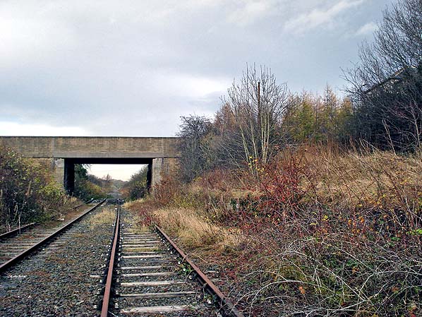 Looking north towards Front Street bridge at Sherburn Colliery station in November 2009. The goods dock is to the right of the camera, obscured by vegetation. It was served by a single siding that was lifted shortly after closure to goods traffic.