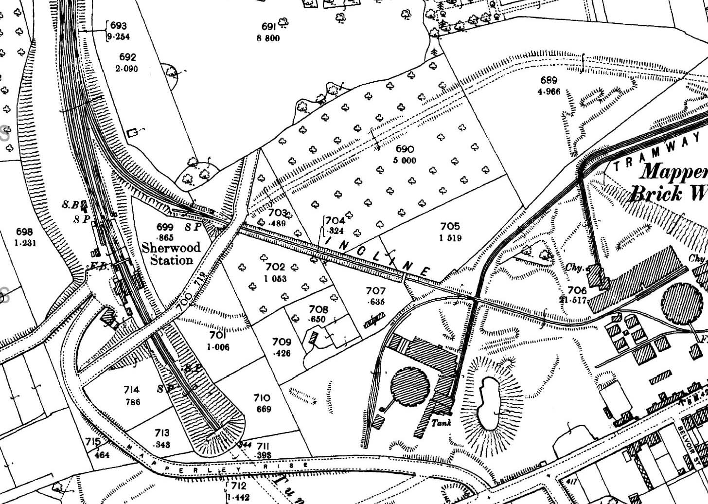 1900 1:2,500 OS map shows the layout of the station and goods yard. The station fronts onto a forecourt at the end of Mapperley Rise. The main station building is seen on the down side with the stationmaster's house at the end of Mapperley Rise. The lamp room, which also acted as a Porters' room, is at the back of the down platform immediately north of Sherwood Bale Bridge. The two platforms continue in the cutting on the south side of the bridge; the north portal of Sherwood Tunnel is at the end of the cutting. The entrance to the goods yard is from the forecourt, with a weighbridge and office shown just inside the entrance at the back of the cattle dock which is seen behind the north end of the down platform. Sherwood's 30-lever signal box is seen just north of the dock. The yard comprises two parallel loop sidings from which a short siding runs into the dock. On the down side there are two exchange sidings, one running to the north end of the up platform. There is an end-on connection with the rope-worked incline to Mapperley brickworks. A second bridge over Sherwood Vale is seen at the bottom of the incline. Ascending and descending trucks were controlled from a small brick-built hut seen to the east of this bridge.