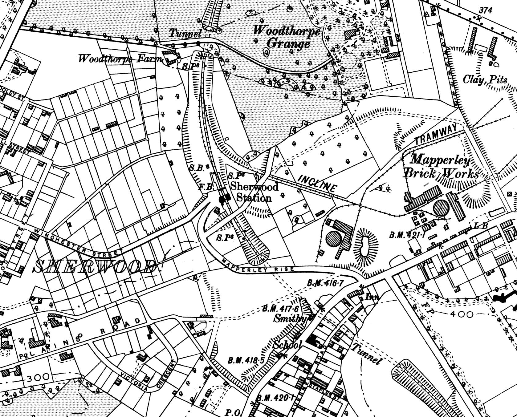 1901 1: 10,560 (6") map showing Sherwood station and the surrounding area. Sherwood Tunnel is seen to the south with the 70yd Ashwell's Tunnel to the north. Note the cart track to Woodthorpe Grange above the tunnel; this is the reason why a tunnel was required rather than a cutting. A rope-worked incline to the north of the station served the Mapperley Brickworks of the Nottingham Patent Brick Company. To the south of the station, on the down side, another siding ran into the Nottingham Builders' Brick Company works.