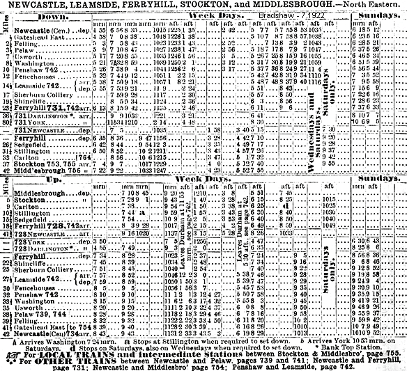 During the 1920s bus routes linking the closely spaced villages of the Durham coalfield began to offer stiff competition to railway services. In the case of Shincliffe the demand for public transport was to and from Durham, whose city centre was 2½ miles north- west, whilst the railway provided a north-south service to the distant centres of Newcastle, Sunderland and Darlington. The station stood in a lightly populated area adjacent to the main road to Durham and was inconveniently placed to serve Shincliffe village which was a mile north, and on the way to Durham. As noted above, the colliery close to the station had ceased to operate as early as 1875. The table below shows that in June 1920 the weekday train service offered by the North Eastern Railway was far from frequent. On Sundays a morning and evening train called in each direction.