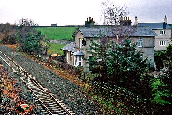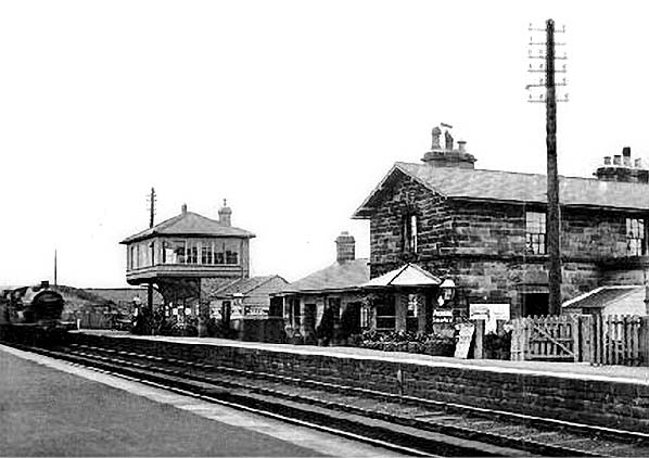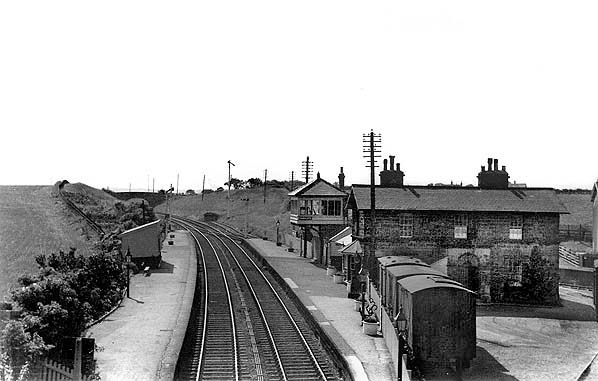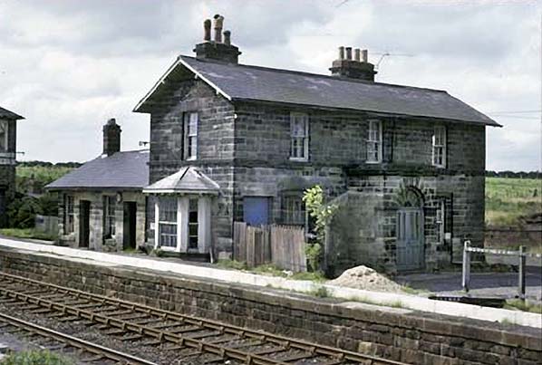 Shincliffe was provided with an attractive station building by G T Andrews, described by Fawcett (2011) as the ‘classic example’ of his work for the N&DJ company. Adjoining the down platform, the building had its axis at right angles to the tracks and was constructed of sandstone blocks, laid in courses, with a ridged slate roof. The distinctive hipped-roof ground floor bay window, favoured by Andrews, faced the platform; when the height of the platform was increased this resulted in the window cill being almost at platform level. An arched porch was centrally placed on the northern elevation. A single-storey extension containing offices stretched south from the two-storey section, and its ridged roof, like that of the two-storey building, had a generous overhang. A signal box stood on the platform immediately south of the passenger buildings, the upper portion cantilevered out so that the platform was not obstructed. A waiting shelter was on the up platform. No footbridge was provided, passengers having to avail themselves of the road overbridge immediately north of the station.