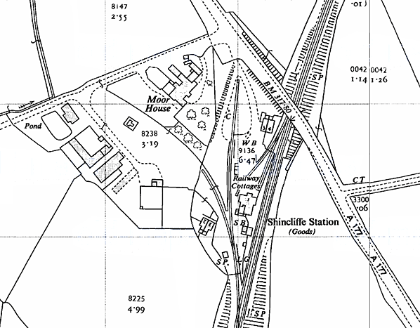 The goods facilities were reached by a loop behind the down platform, and the OS 1897 plan indicates that the loop also served Shincliffe sawmill. The 1920 plan no longer names the sawmill. Goods handled in 1913 consisted of 187 tons of potatoes and 34 wagons of livestock. Pedestrian access to the main building was gained by crossing the loop siding.