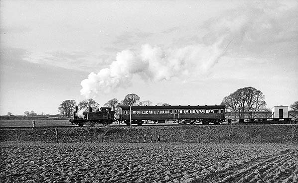 Class 1400 0-4-2T No. 1420, originally Class 4800 No. 4820, pauses at the embankment-perched Shipton-on-Cherwell halt. This is an autotrain and the locomotive is at the rear of a service heading to Kidlington. No. 1420 had been transferred to Oxford shed from South Wales in September 1953 and thereafter would have been a regular on the Woodstock branch. She was working the branch on the final day of service, 27 February 1954. The photograph might deceive some readers into thinking the locomotive is attached to two carriages; in fact it is a single autotrailer of the 70 feet long variety converted from a steam railmotor or railmotor trailer. These vehicles had recessed passenger doorways roughly midway along the body and this is the reason for the illusion.