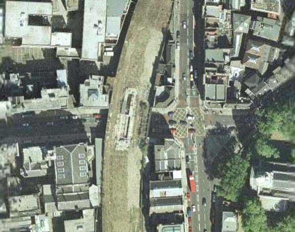 This 2005 aerial photograph of the Shoreditch Station site appears to show demolition of the platform taking place during the construction of the East London Line extension.