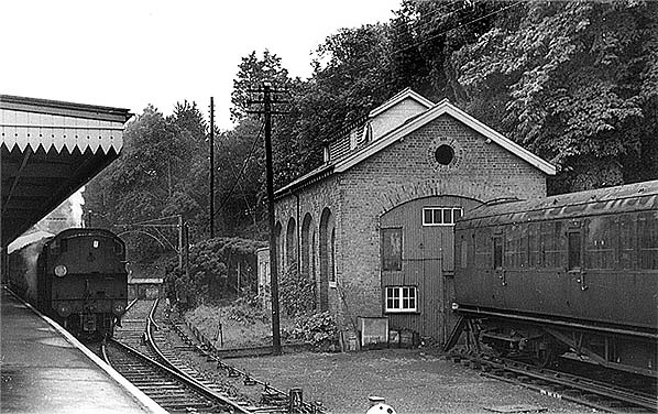 Sidmouth engine shed in 1962. The shed closed in the late 1930s after which it was put to other uses. Note the new windows in the train doors.