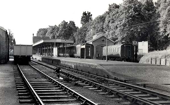 Sidmouth looking south from the run-round loop. The goods shed is seen on the left with the engine shed on the right. A train has just arrived in the short platform road, c1960s