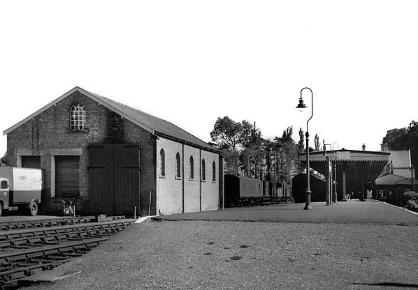 Sidmouth station and goods shed looking south towards the bufers in August 1963.
